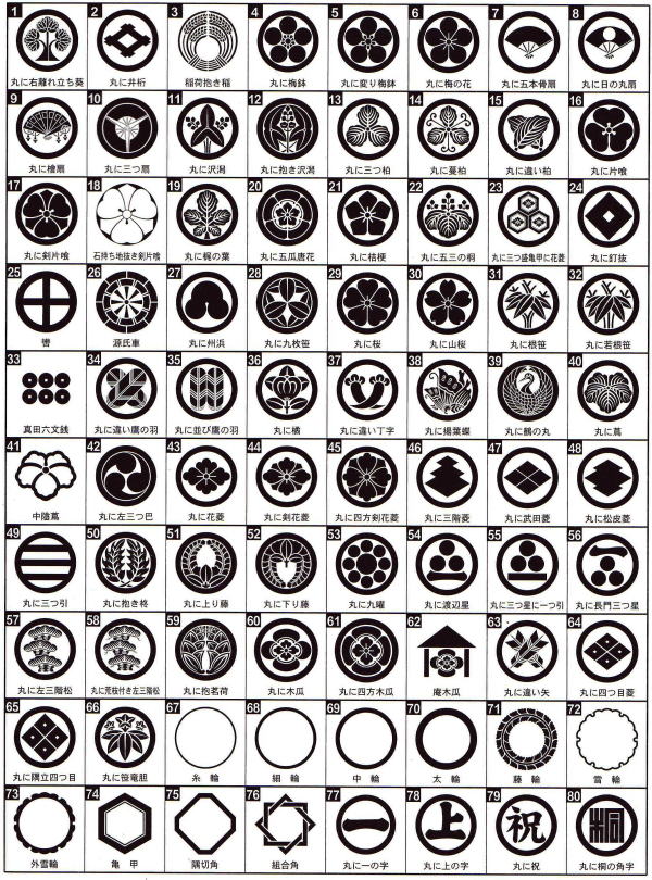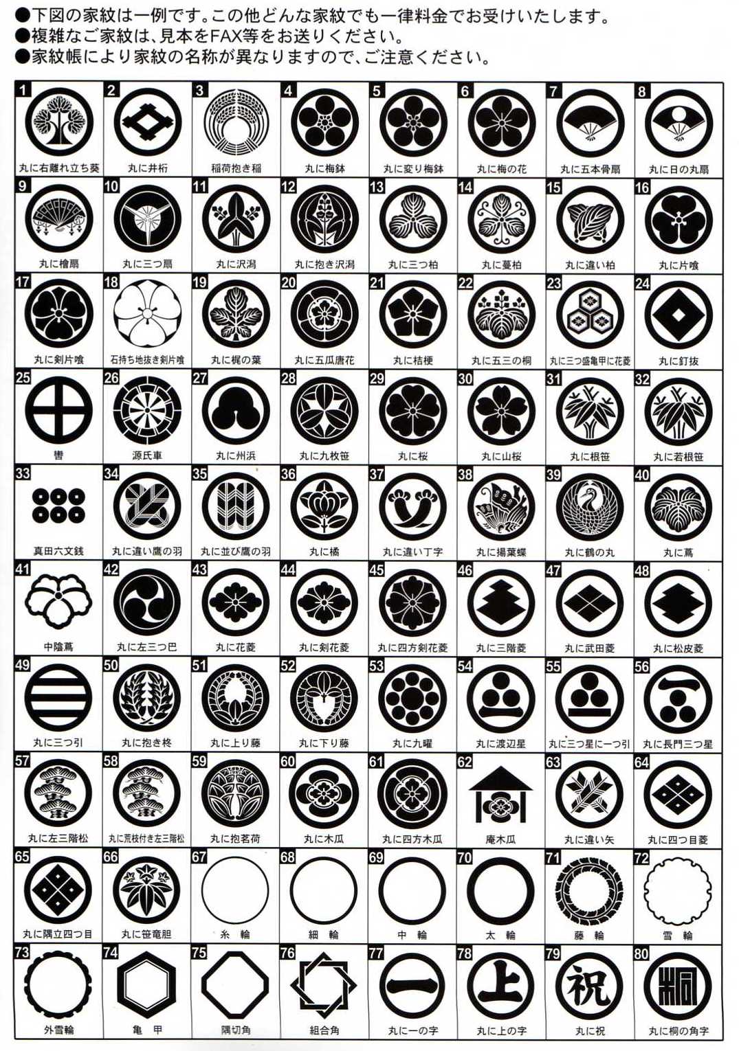 | 家紋は下記の見本よりお選び下さい。複雑な特殊家紋をご希望の場合は それぞれの家紋帳により名前が変わりますので写真やコピーにてお願い致します。 家紋表の拡大画像は→こちら |