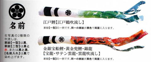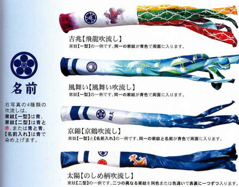 | 吹流しにより家紋染色の色が決まっております。青色:(星歌、吉兆、京錦、千寿、風舞い、太陽) 黒色:(福寿、江戸鯉、金銀宝船鯉、黄金兜、錦龍)でございます。 |